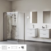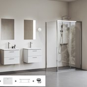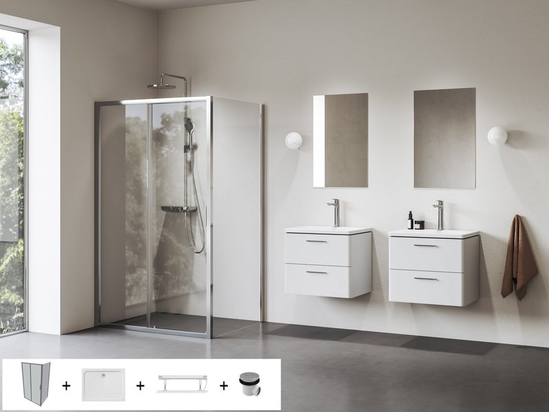 Soodushinnaga komplekt sisaldab läikiva nurgadušinurka Blix II koos dušialuse, toe, viimistluspaneeli ja sifooniga. Dušinurka saab valida kahe mõõtme vahel: 100x80 cm või 120x90 cm. Komplekti L/R käelisust määratakse dušialuse esipaneeli järgi , vasak L või parem R.